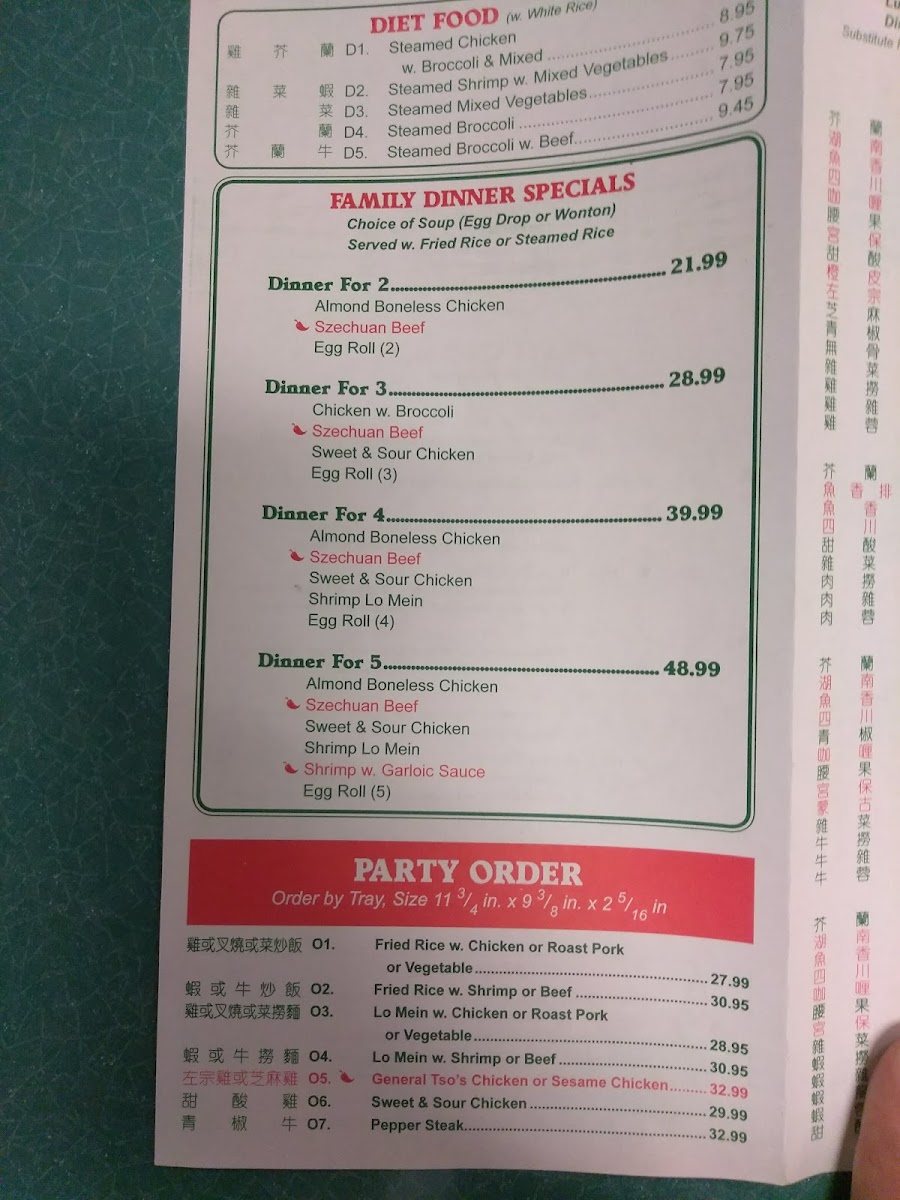 You’ll find popular choices such as General TSO's Chicken, House Special Lo Mein, and comforting soups like Egg Drop Soup, alongside steamed dishes featuring chicken, shrimp, or mixed vegetables that are ideal for those seeking lighter or diet-conscious fare. Appetizers like Egg Rolls and Cream Cheese Wontons add a satisfying start to any meal, while party-sized orders make sharing easy during informal get-togethers.